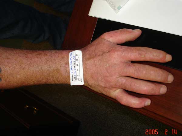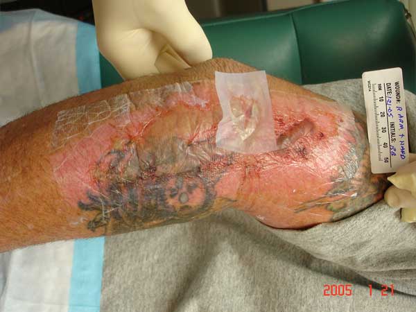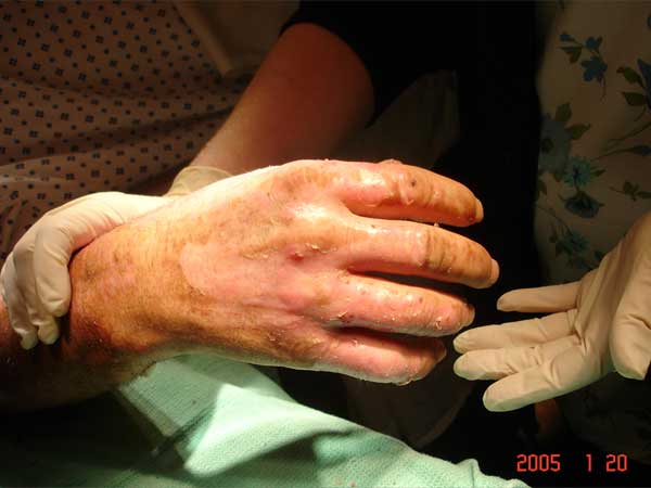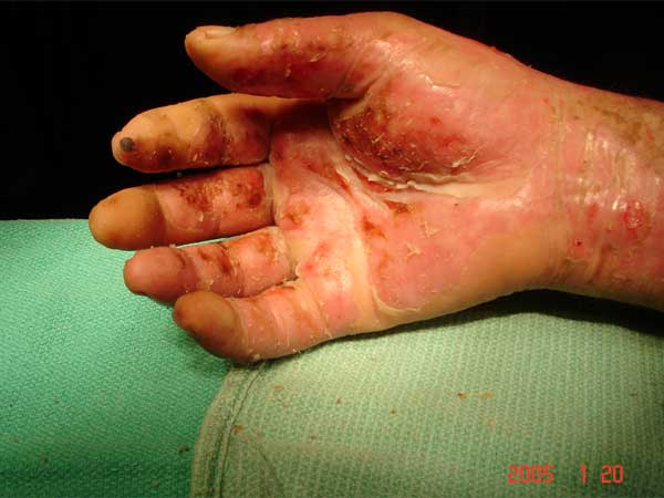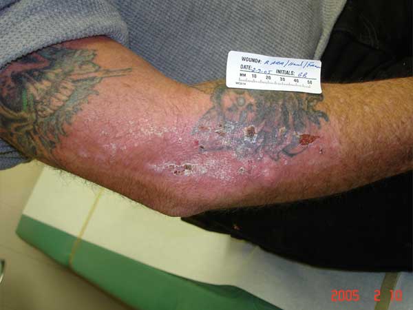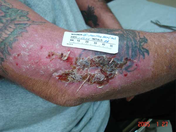 Paitient presented with second and third degree gasoline burns on right arm and hand, requesting pain medication